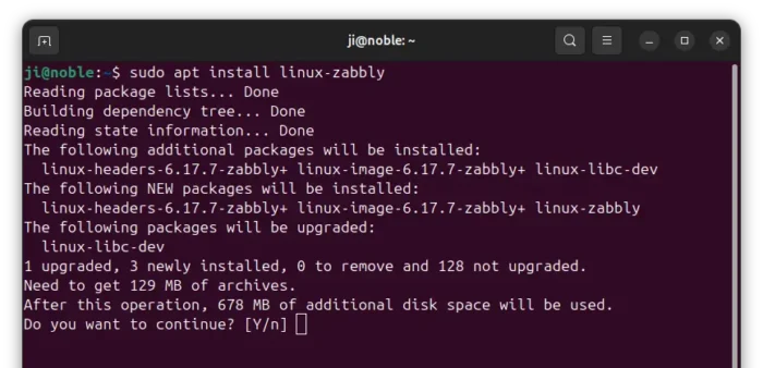 Depends on when you tried this tutorial, the package version varies. So, I use asterisk wildcard in command to auto-select any package start with ‘linux‘ and have ‘zabbly‘ in between of package name. Just in case, it’s better to keep an eye on terminal output before hitting ‘y’ to confirm.