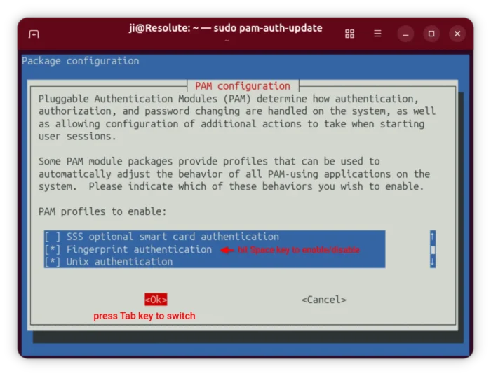 In next screen, use up/down arrow keys to choose “Fingerprint authentication”, then press space-bar to enable/disable it. Finally, press Tab to highlight OK and hit Enter.