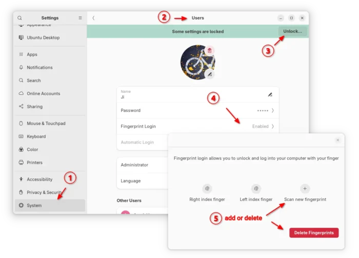 UPDATE: The default GNOME desktop now supports managing your fingerprints. Open Settings then navigate to System -> User, unlock then click “Fingerprint Login” to add or delete fingerprints.