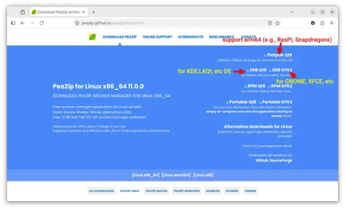 PeaZip provides Linux packages in 3 different formats. They include native .deb/.rpm, portable tarball, and universal Flatpak package. While, native .deb/.rpm is recommended for better integration.