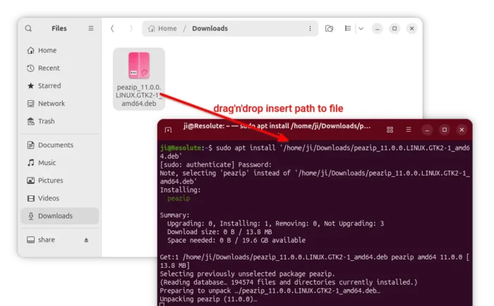 If you didn’t save the package into user Downloads folder, then drag’n’drop the DEB package into terminal instead of typing ~/Downloads/peazip*.deb.