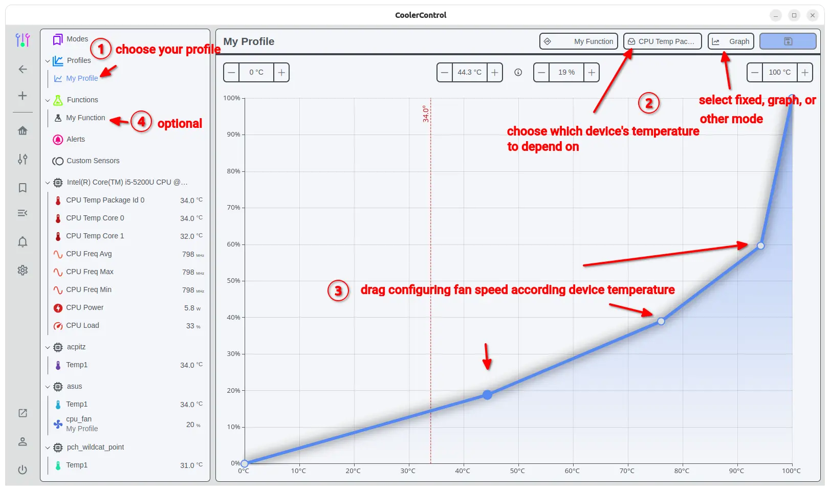 Then, navigate to that profile in left panel, choose a working mode (Graph for example), choose a device temperature to monitor. Finally drag moving the dots on graph to set your desired fan speeds according to the temperatures.