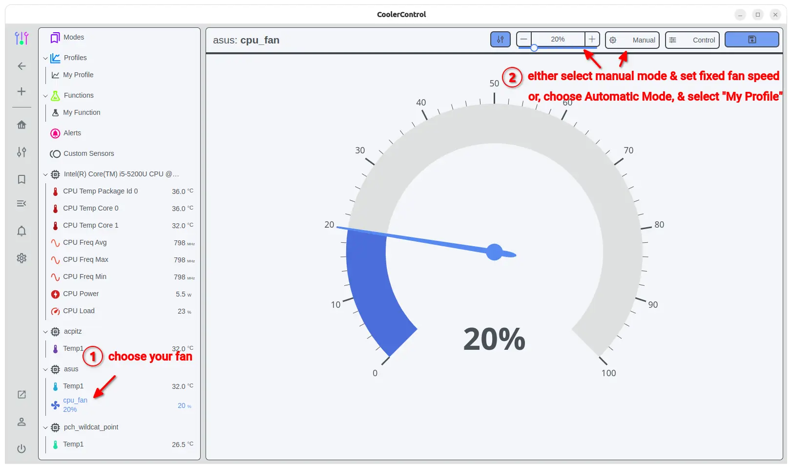 If you want to make your fan speed changes automatically according to CPU/GPU temperature, then select “Automatic” mode in the screenshot page above, then choose a profile (e.g., “My Profile”).