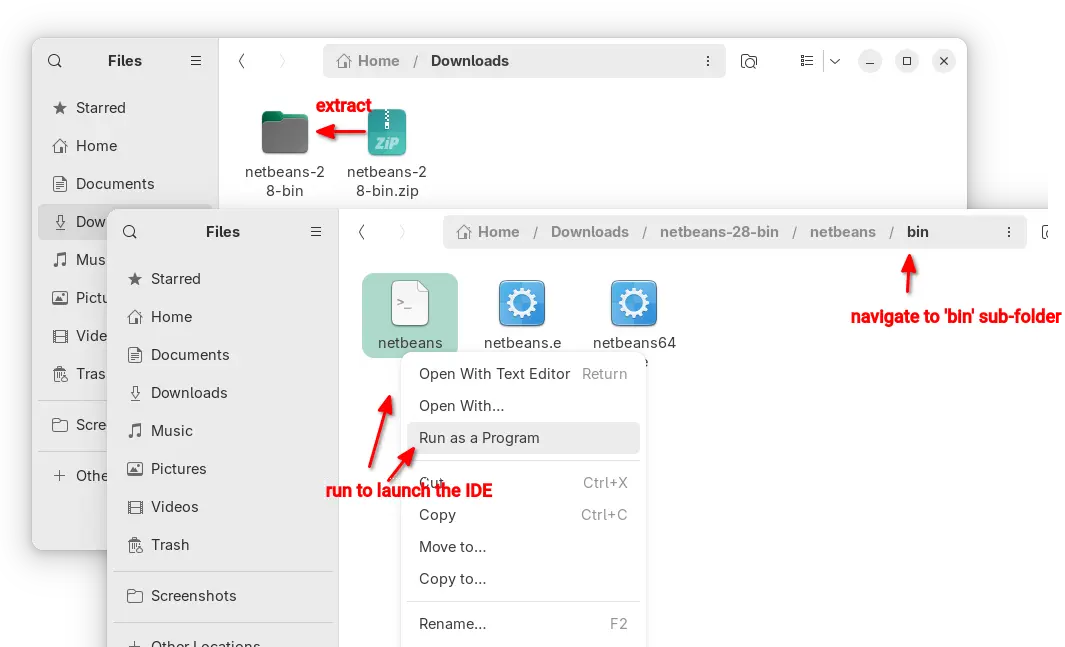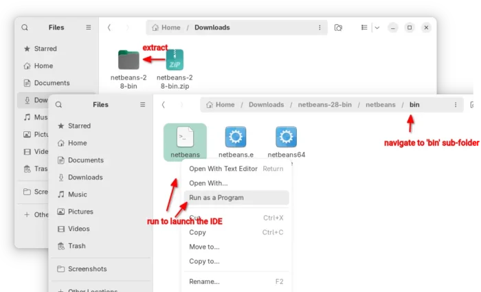 It’s non-install portable tarball for Windows and Linux. Just grab it, decompress, then navigate to the bin sub-folder. Then, you may run the executable file to launch NetBeans from there.