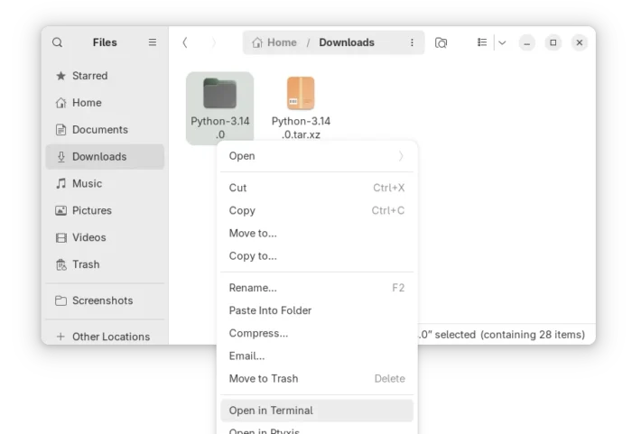 2. After that, open Downloads folder, and decompress the tarball. Then, right-click on the extracted source folder and select “Open in Terminal” to open the Python 3.14 source folder as working directory in terminal.