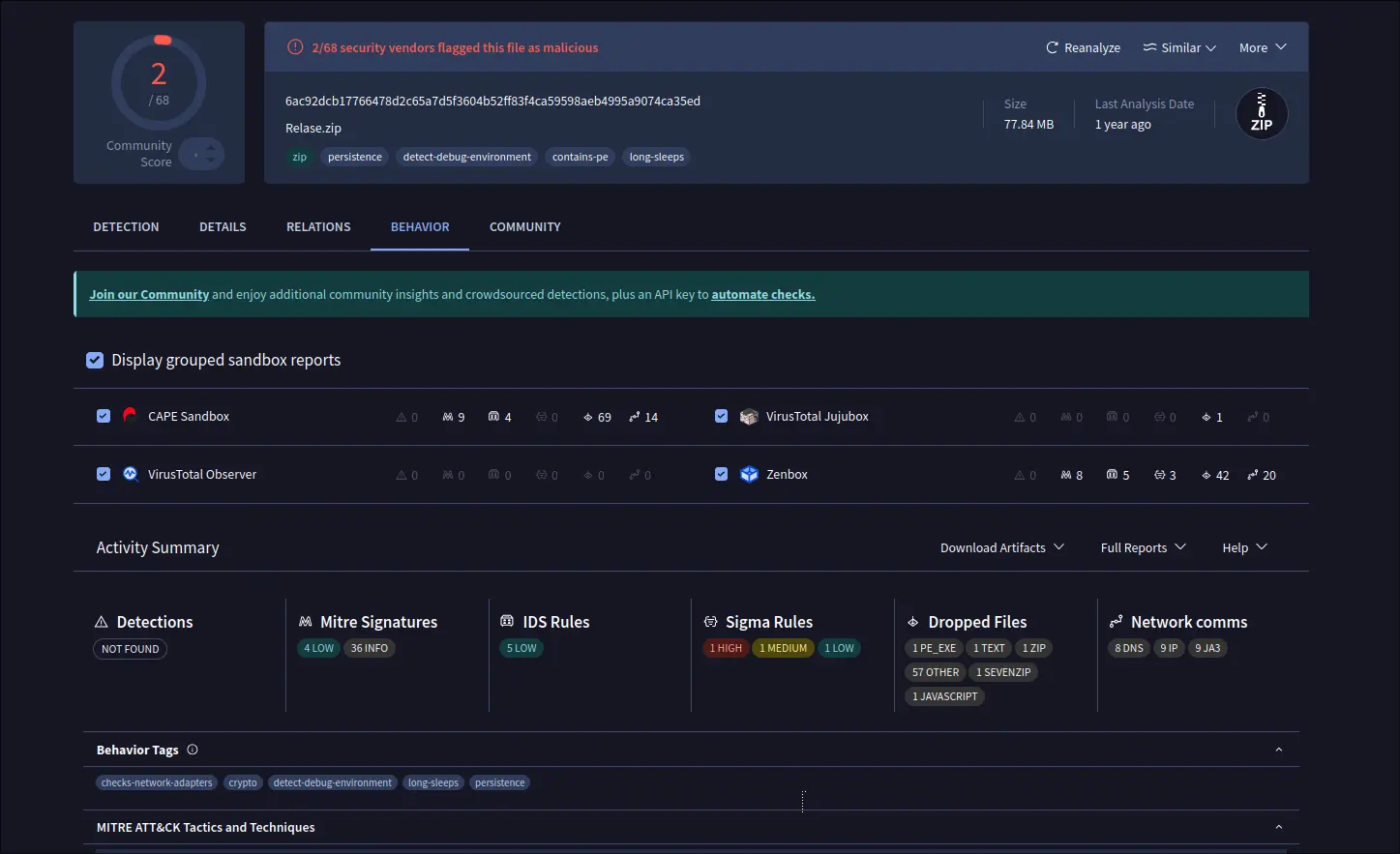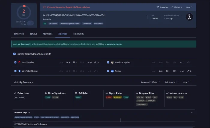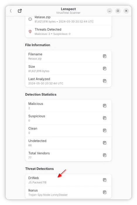 Lenspect uses VirusTotal API to upload you files, then show you a scan summary, while you may click open in VirusTotal website for a more detailed information, including analysis from different antivirus products, file details, and more.