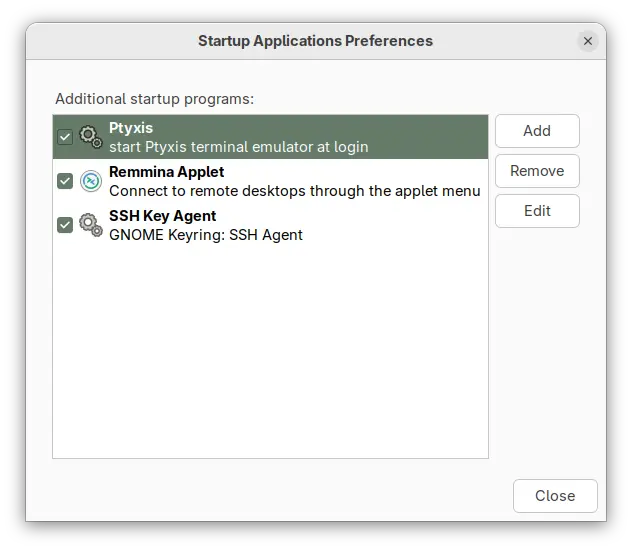 Ubuntu has a “Startup Applications” tool, allowing to easily add, remove, and edit items run at user login. Due to upstream (meaning GNOME) changes, it has finally been dropped in 25.10.