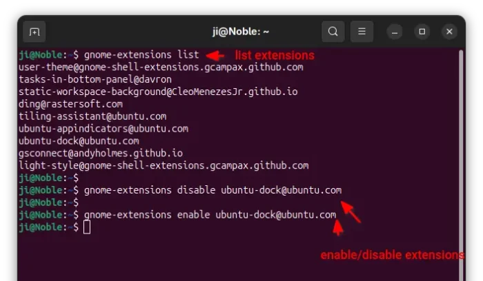 Here replace disable with enable if you want to enable an extension. And, replace extension ID [email protected] accordingly.