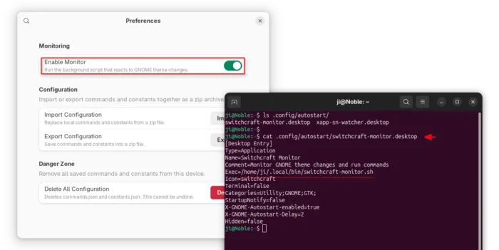 Then, it will auto-run the switchcraft-monitor.sh script under .local/bin folder in next login, monitoring your desktop color scheme and running the commands automatically.