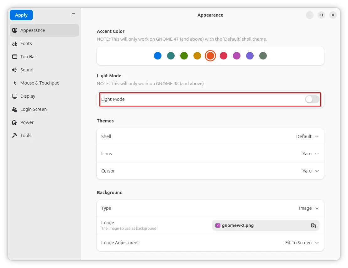 In the past 12 months, only few features were added. One is the “Light Mode” toggle option under Appearance tab, which works for GNOME 48 and above.
