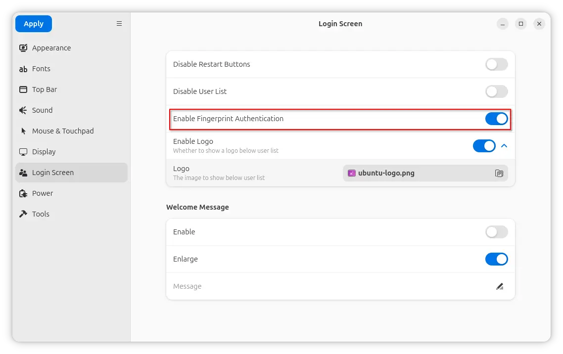 Another is a new Enable Fingerprint Authentication toggle option added to ‘Login Screen’ page. It can be useful when you want to use fingerprint authentication for your GNOME desktop environment except the login screen, as you know log-in without password will cause unlock keyring pop-up when launching Chrome etc application though it can be skipped.