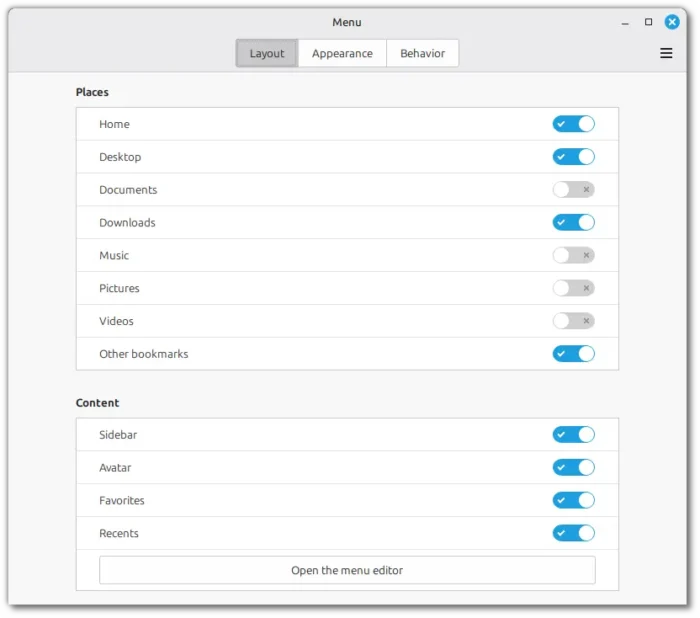 In addition, the search bar can be moved to either top or bottom of application menu. While, the system buttons (e.g., lock, log-out, power-off) can be placed to either follow the search bar or in the bottom of left sidebar.