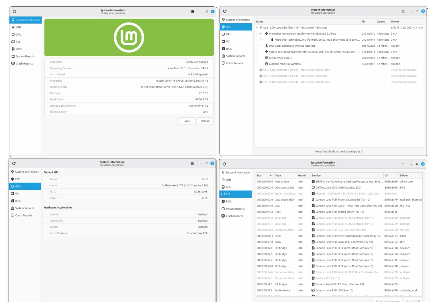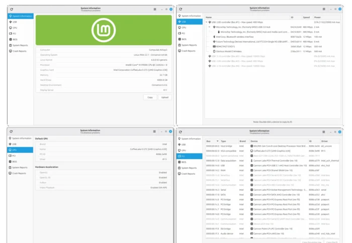 It as well shows you GPU info including the driver and hardware acceleration status, PCI devices, motherboard and BIOS info, and the previous system reports and crash reports.