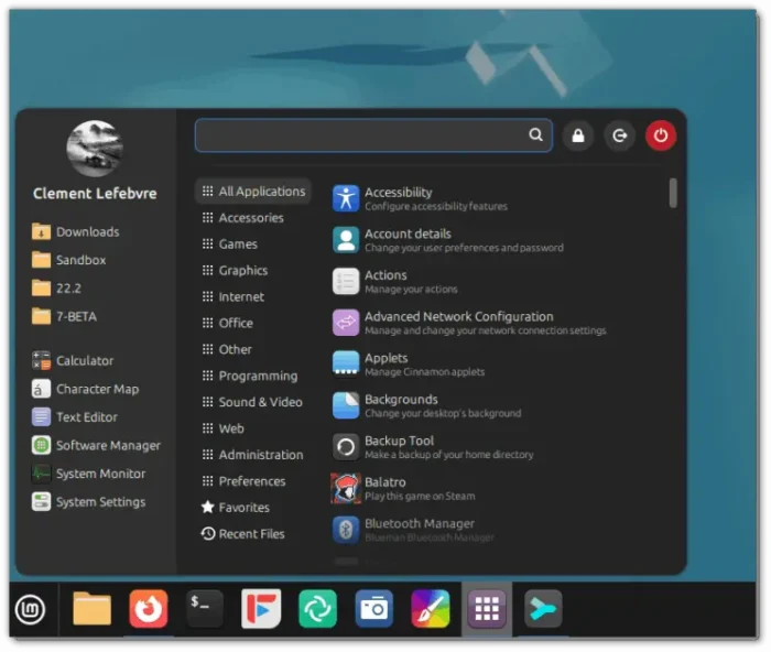 First, the Cinnamon menu is redesigned. As you see in the screenshot above, it features a left sidebar that displays user avatar, places (user folders), and favorite apps. While, user has the choice to disable any of them, and even disable the whole side-bar.