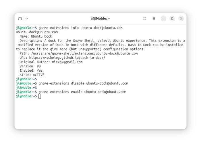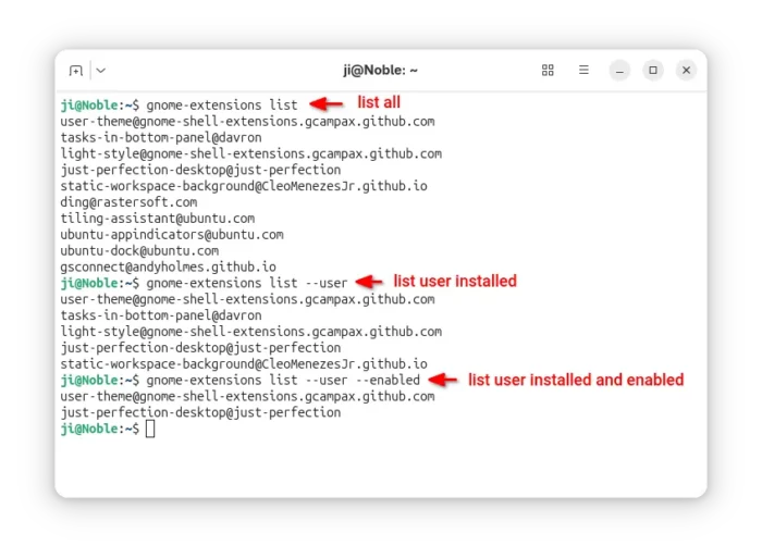 The command line tool gnome-extensions is useful for advanced users and developers for scripting purpose.