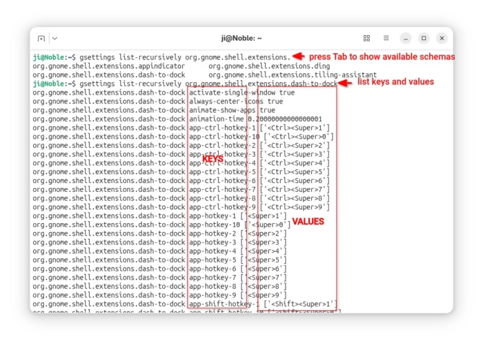 $SCHEMADIRand$SCHEMAin next commands without typing full PATH and settings schema. - Next, run command to list all the available keys and their values: