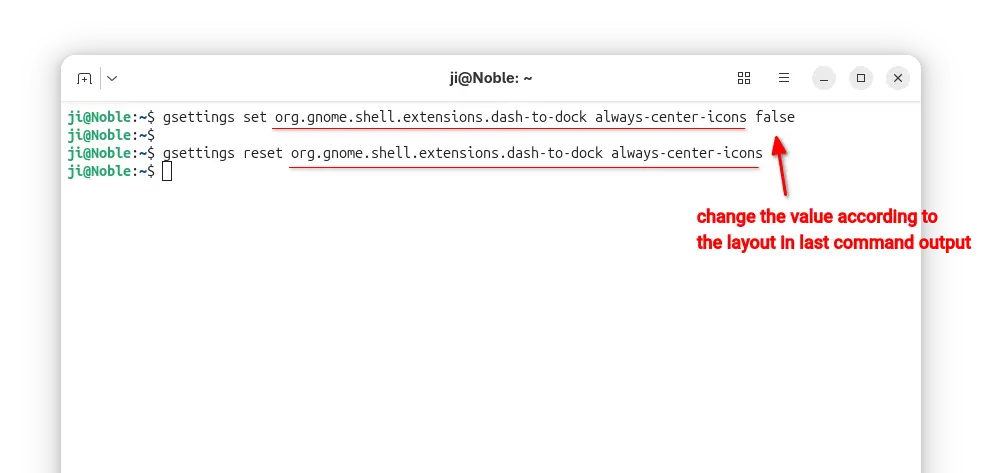 Also replace extension name dash-to-dock, key-name always-center-icons, and key-value false according to the last command output.