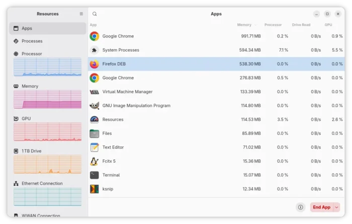 - Resources system monitor and task manager to replace Gnome System Monitor.