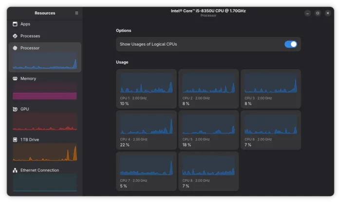 Resources is a free open-source Rust written application that uses GTK4 + LibAdwaita to provide a modern UI for monitoring system processes and resources.