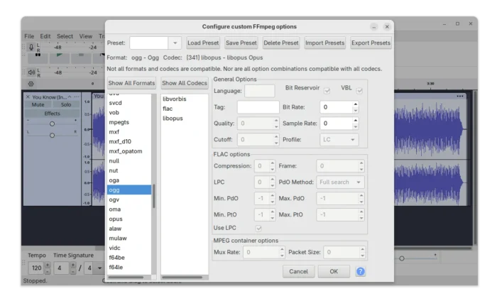 With the most recent FFmpeg library, it supports loading more audio codecs, such as Sanyo LD‑ADPCM, G.728 (.g728), and ADPCM IMA Xbox. And, custom FFmpeg export options now supports exporting to OGG/Opus audio formats using the libopus codec.