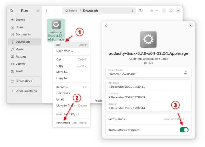 It’s a non-install Linux package format, that has most runtime libraries in bundle. Simply add executable permission from file properties dialog, then run it to launch the audio editor.