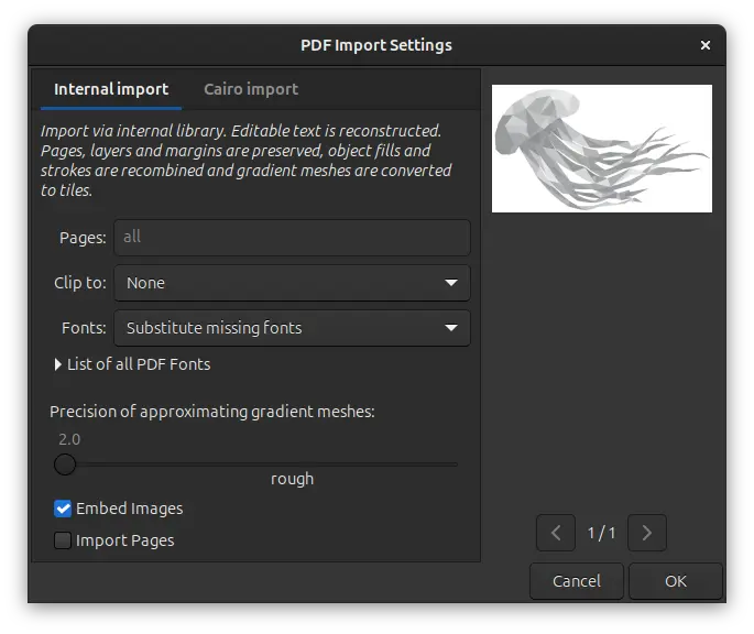 And, it does no longer imports unnecessary (in SVG) clipping paths from PDF files, and accurately suggests substitution fonts when importing PDF with text.