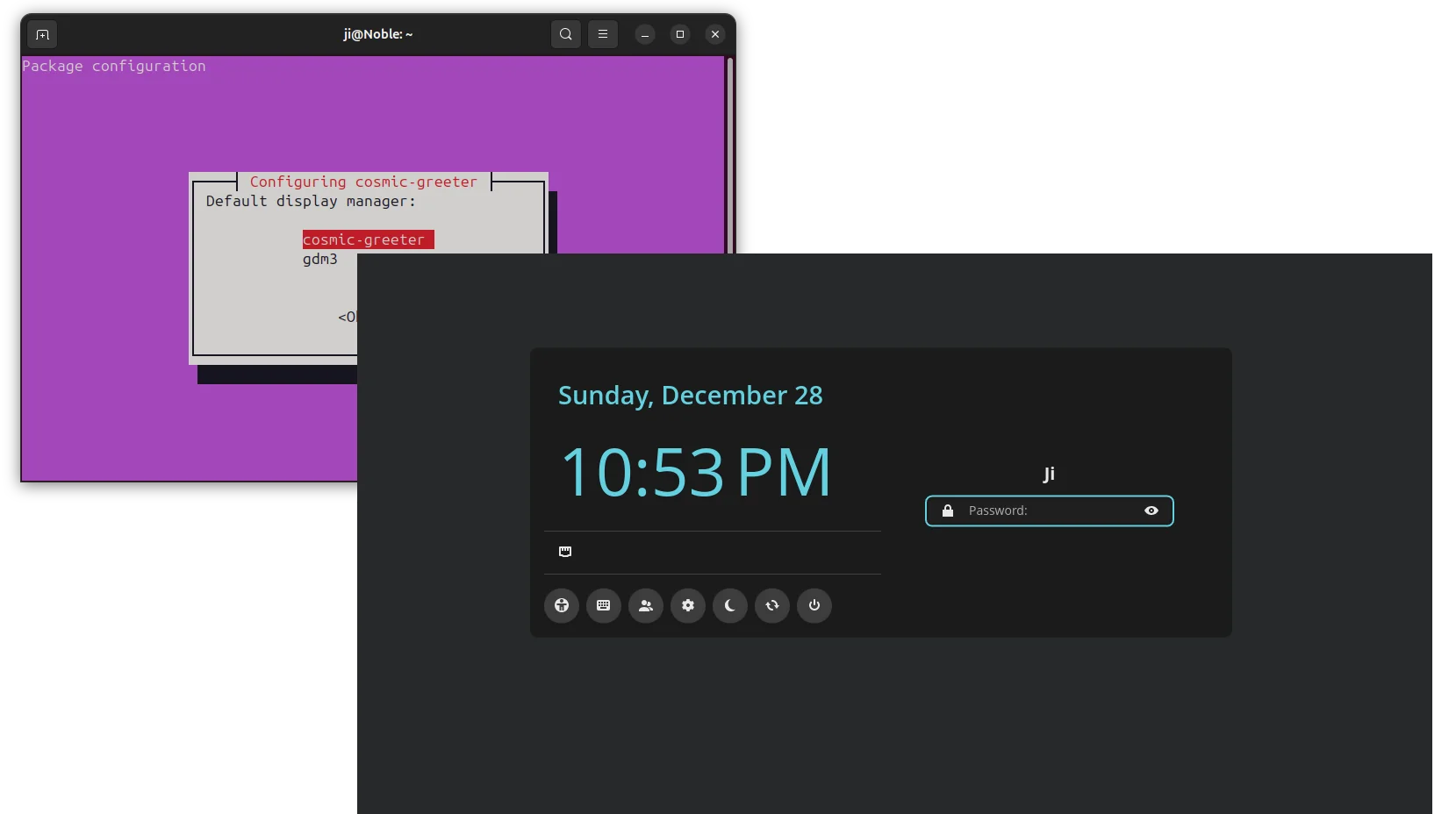 During the installation process, it will ask for choosing the default display manager. And, by choosing “cosmic-greeter” (press Tab to select OK), the login screen will change to be cosmic style.
