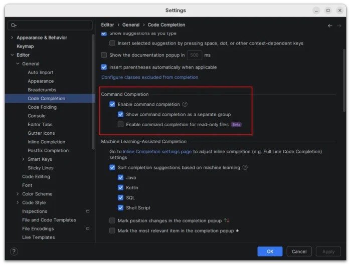 This feature was initially introduced in last 2025.2 as Beta feature, now enabled by default in this 2025.3 version. While, a new “Enable command completion for read-only files” is available as new beta option.