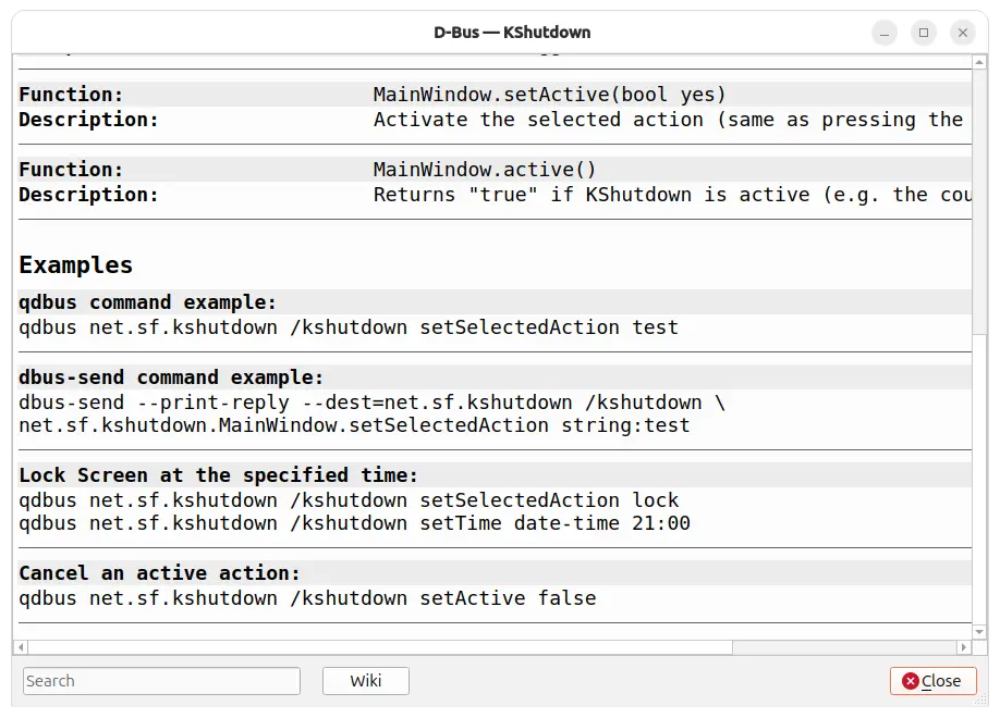 For those who would like to use Kshutdown in command line, e.g., for scripting or automation purpose, the new version added the D-Bus help dialog which can be launch from Help menu.