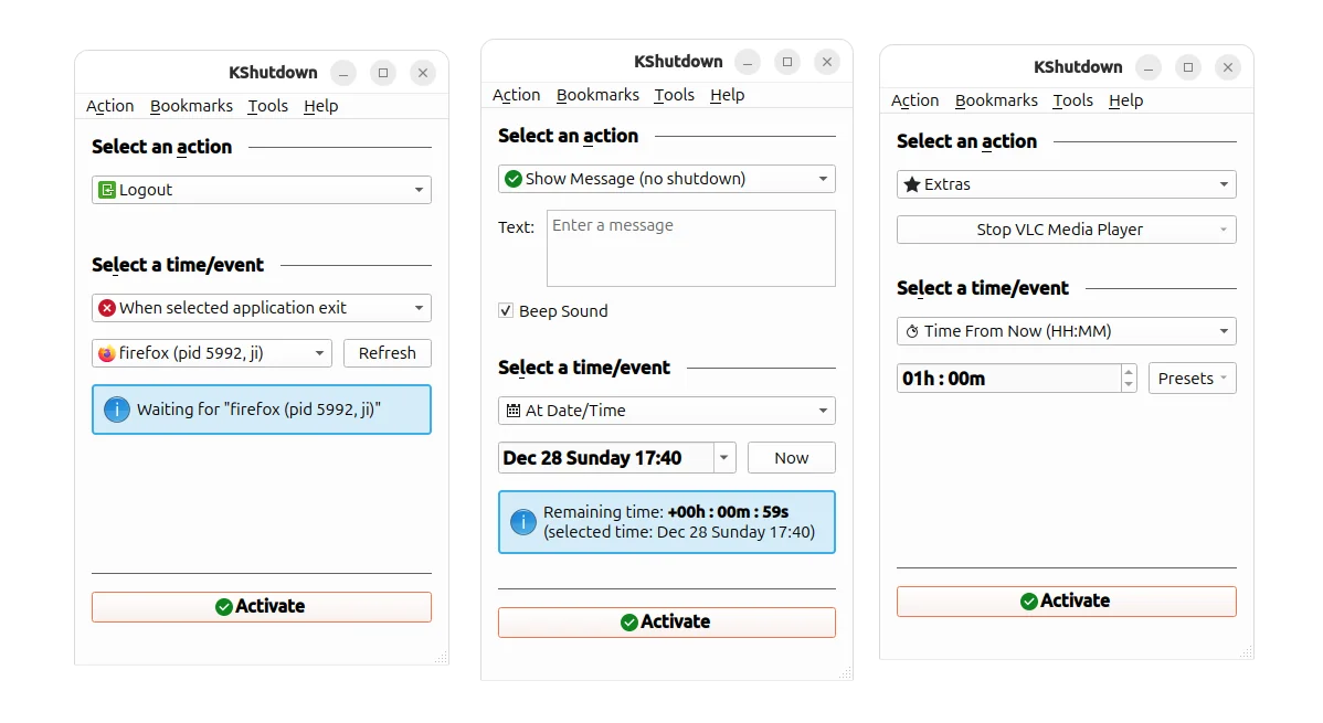 The app can automatically shutdown, restart, hibernate, suspend your system, log-out or lock/un-lock your screen, as well as run custom command or popup a message dialog.