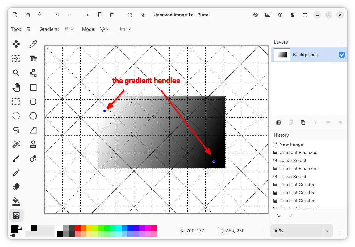 User can drag moving the handles to change the gradient length and direction, or click anywhere apart from any handle to create a new gradient, and hit Enter to finalize the gradient and remove the handles. And, creating, modifying or finalizing gradient will add a new history item.