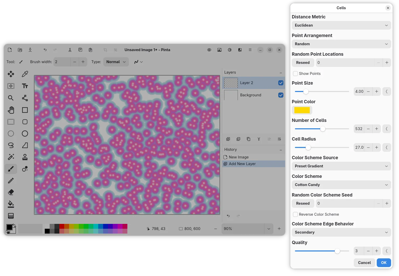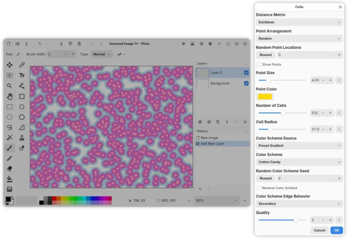 Pinta 3.1 introduced new Cells effect which can be accessed from “Effects -> Render” menu. It can add worley noise in selected area or the whole canvas with custom point arrangement, point size, cell numbers, and color scheme.