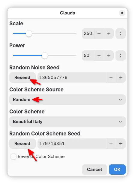 And, Render effects (e.g., Clouds, Julia Fractal) now support Random values and Reseed button.