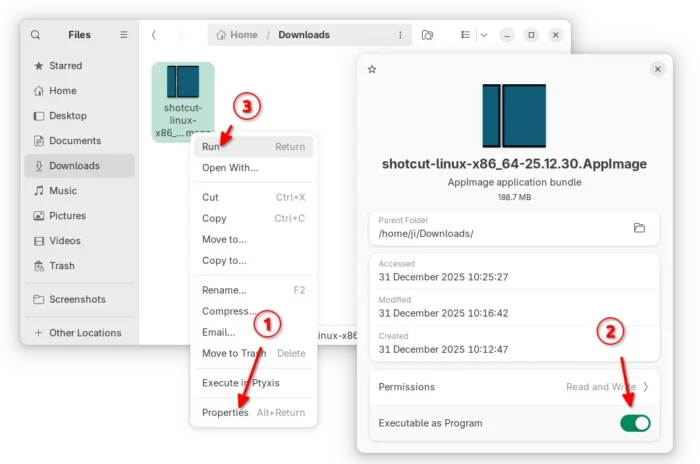 Option 1: Select download the AppImage package from link above. Then, add executable permission from file properties. Finally, click run to launch the video editor.