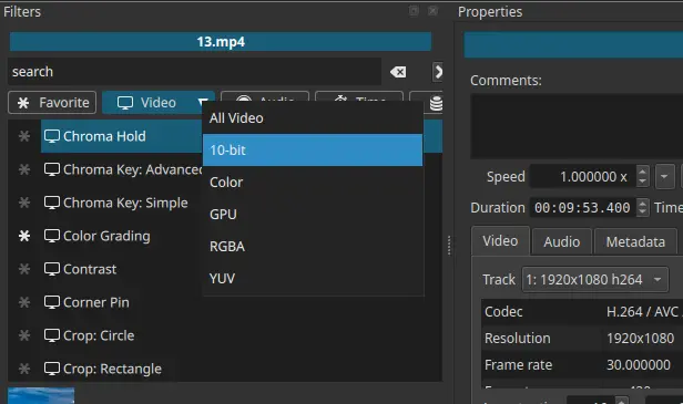 When adding filters, the “Video” category now has a drop-down menu, allowing to sort video filters with GPU, 10-bit, Color, RGBA, and YUV flags.