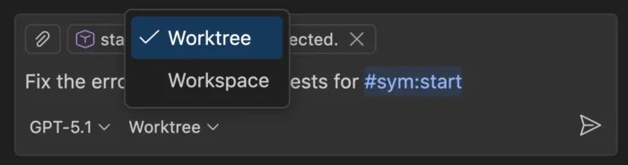 When creating a new background agent, user can now choose to run in either the current workspace or a dedicated Git worktree. And, when running a background agent in a worktree, the changes is isolated in a separate folder, thus you can run multiple background agents simultaneously without conflicts.