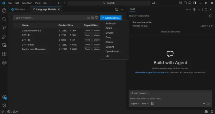 VS Code 1.107 also introduced Language Models editor which provides a centralized place to view and manage all available language models for chat in VS Code.