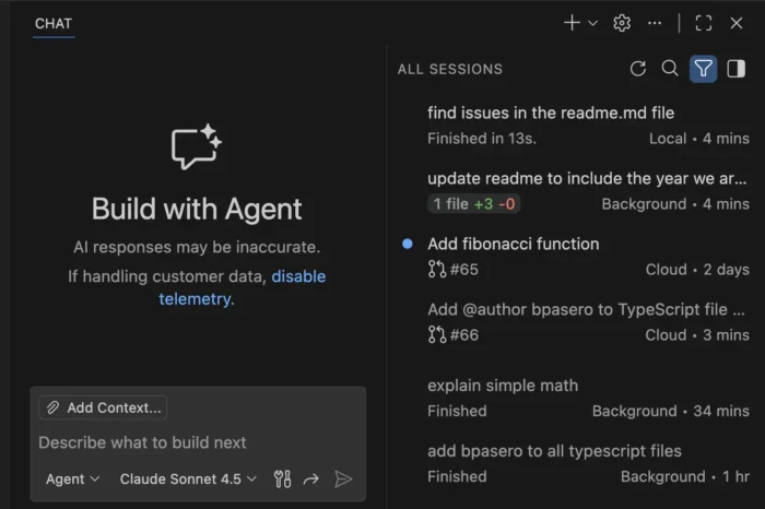 The new release of this free open-source code editor integrated the agent sessions into the Chat view. When working in a workspace, it only shows sessions related to the current workspace, while all sessions across workspaces are shown when you are in an empty window.
