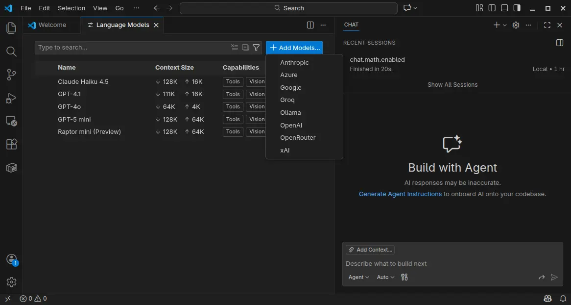 VS Code 1.107 also introduced Language Models editor which provides a centralized place to view and manage all available language models for chat in VS Code.