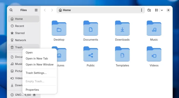 GNOME Files (aka Nautilus) in this version got a big performance improvements for thumbnail loading via new custom widget. And, the context menu (right-click menu) for Trash or Recent now include an option to open their own settings page.
