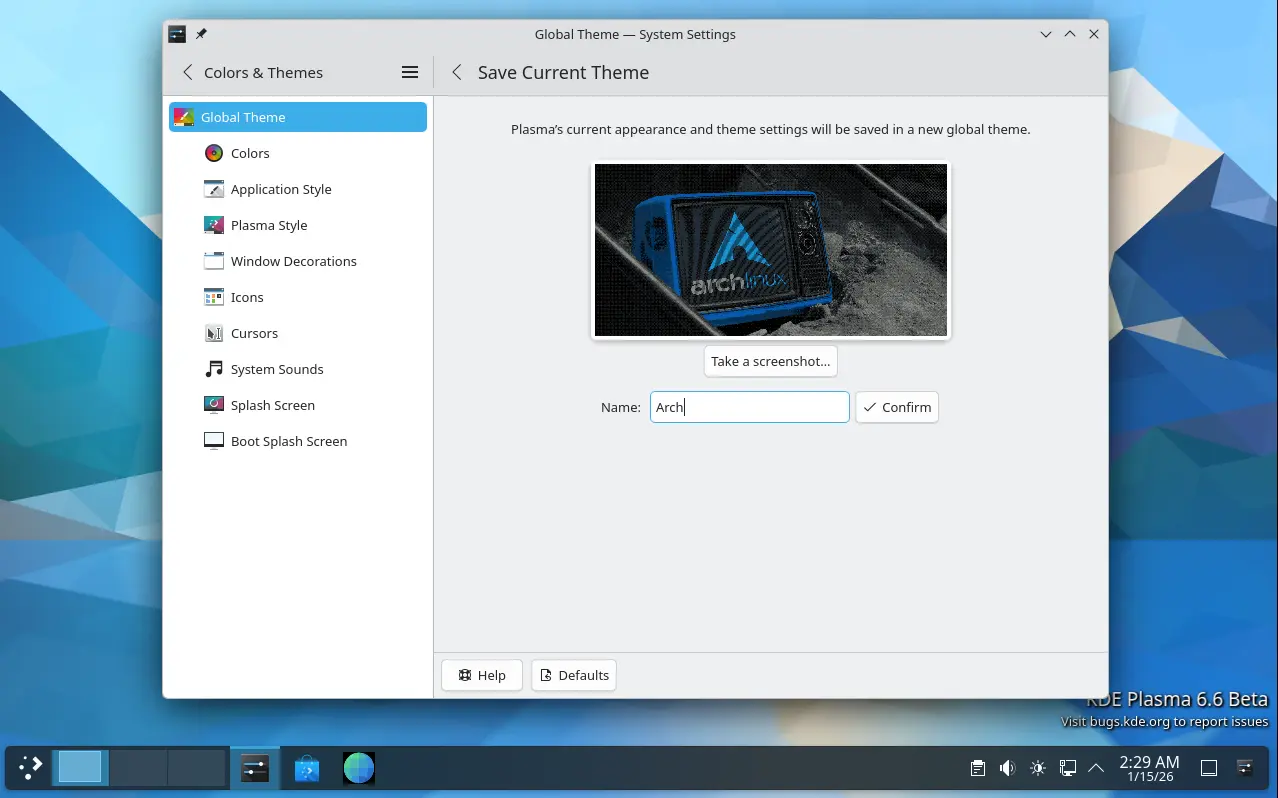 First, in Colors & Themes setting page, it now provides a “Save Current Theme” button, allowing to save current settings (e.g., colors, window decoration, icons, cursors, desktop and window layout) as a custom global theme with unique name and thumbnail image. After that, it’s displayed as one of the global theme choices.