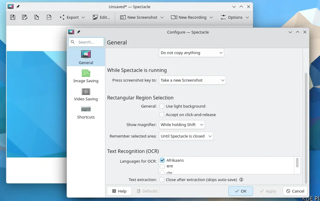 The screenshot tool Spectacle has been updated with a “Cancel” button during screen capturing which is useful for touchscreen users. It features new OCR support for extracting text from screenshots with multiple languages support, though you need to install tesseract first. And, an option is added to skip automatic saving during OCR text extraction.