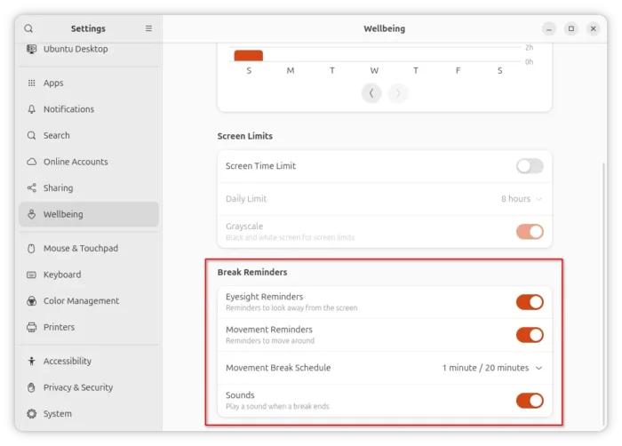 As you know, GNOME 48 introduced “Wellbeing” settings page, allowing to view screen time usage, set screen limits and break reminders to take breaks in schedule.