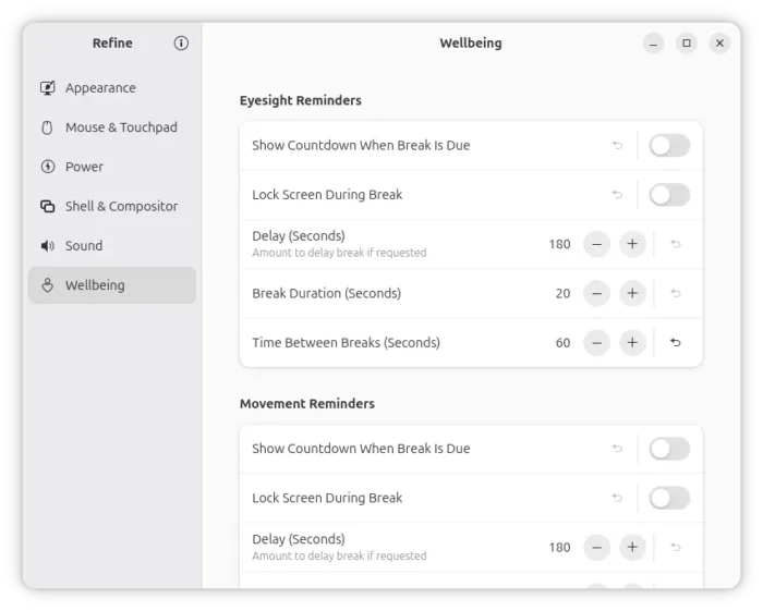 Besides struggling with gsettings command or discovering with Dconf Editor, Refine since 0.7.0 now provides “Wellbeing” page, provide a stupid simple and clean interface to configure these hidden options for GNOME 48+.