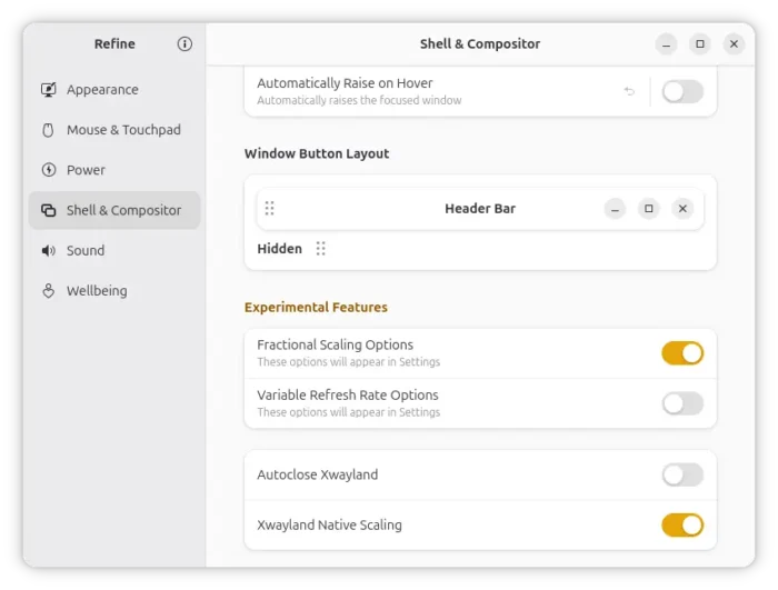 It also allows to configure window header click actions, drag’n’drop adjust window buttons (minimize, maximize, close), and enable some experimental features such as fractional scaling, Variable Refresh Rate (VRR), and Xwayland Native Scaling.