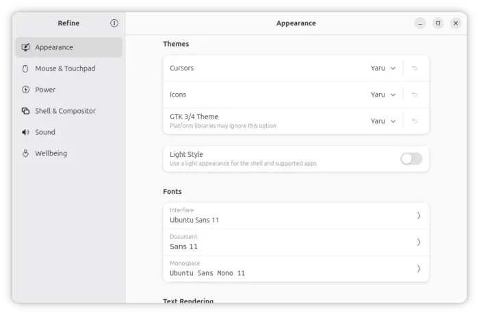 Refine so far contains “Appearance” page to configure themes, fonts, text rendering, and background rendering options, as well it allows to enable “Light Style” for light panel and menus.