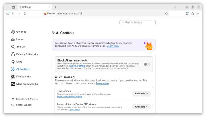 By going to Settings -> AI Controls or access about:preferences#ai, user can now simply use “Block AI enhancements” toggle to disable all AI features, or turn off individual AI features, such as translations, tab group suggestions, link previews, and sidebar chatbot, via their own options.