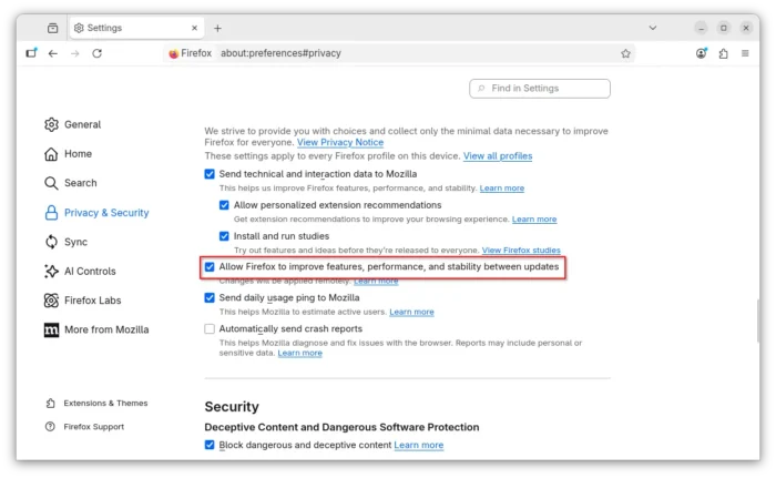 And, user has choice to disable it by going to “Privacy & Settings” settings page, and turn off ‘Allow Firefox to improve features, performance, and stability between updates’ check-box.