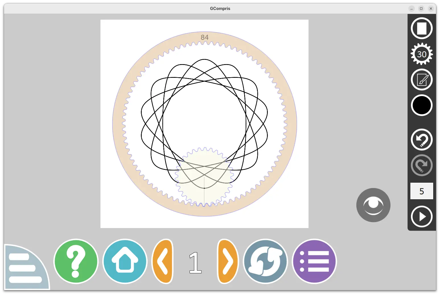 Pupils can choose wheel size, gear size, pen settings and color, and finally click play to roll the gear to start drawing. An eye icon is available to hide the gear and the cogwheel to view the final drawing. And, it supports saving image as SVG along with PNG, and load again (SVG only) from the activity.