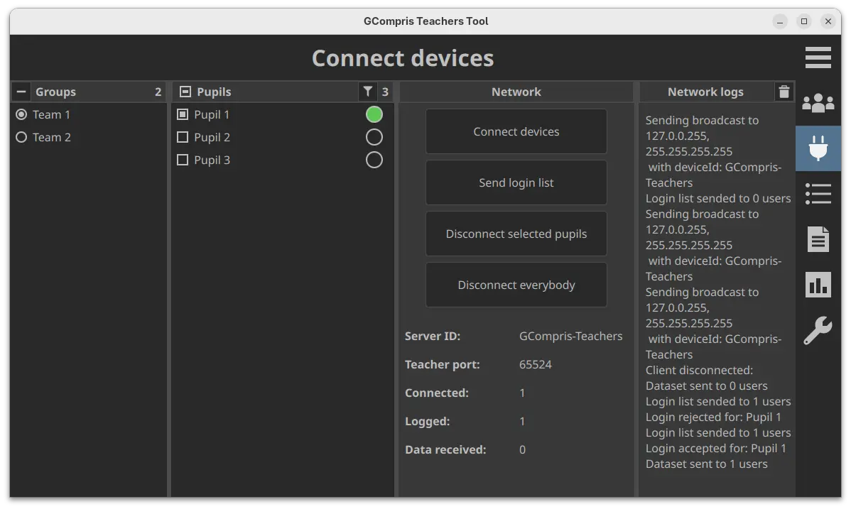 With the new 26.0 version, the official teachers tool is introduced. It allows teachers to create and manage pupils groups, create specific work plans, connect and send a work plan to pupils, visualize the work results per group and pupil, and analyse pupils answers.